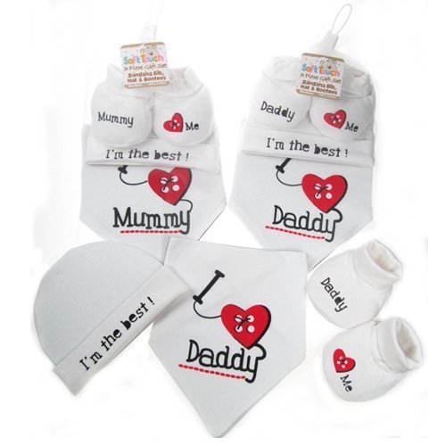 Unisex design;For babies newborn/0-3 months;Soft comfortable cotton;Each set consists of a bandana bib, hat & booties;Choose either Mummy or Daddy design