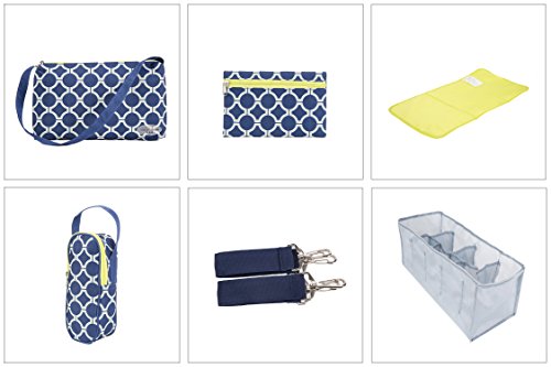 Great fashion Diaper bag for the stylish Mom, Made of 100% Nylon, easy to wipe clean;A personal size purse with carrying strap for busy mom on the go.;Changing pad station & a pair of Grip strollers attachments;Zippered bottle case fit most bottle and a small accessory cases for busy mom to put smaller items;Multiple inside and out Pockets for all your needs
