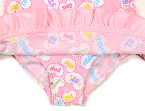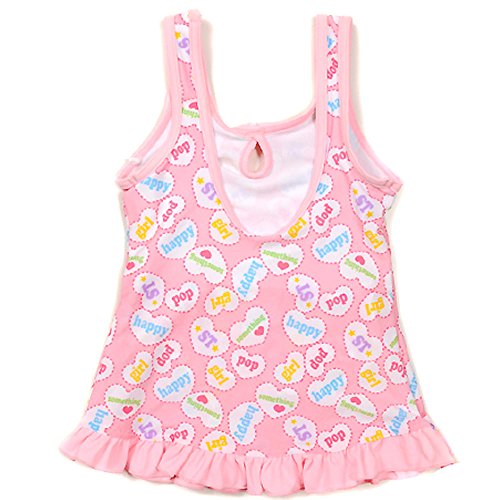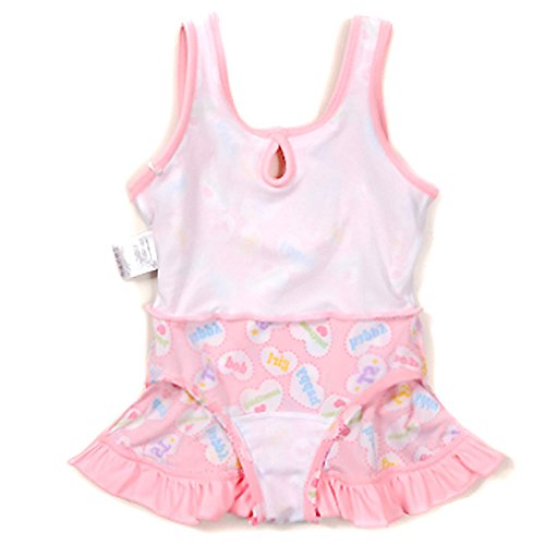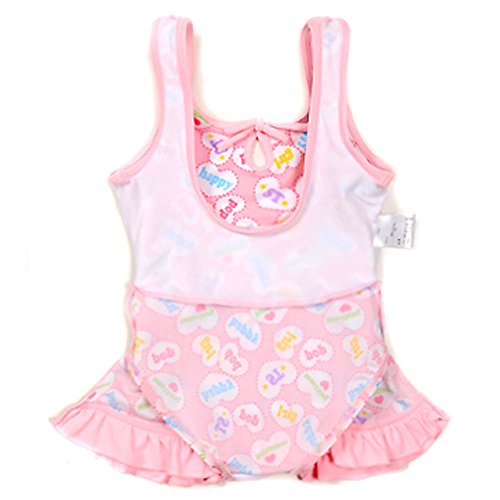 SOMETHING(サムシング)の子供用ブランド水着。裾のフリルが可愛いワンピースタイプの水着です。同柄のスイムキャップ付き。ハート×ロゴがちりばめられたCUTEなデザインです。