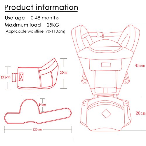 - 適用年齢と体重:赤ちゃんの0-48ヶ月、最大荷重:25KG、シングルシート:20KG、調節可能なウエストサイズは最大47.2インチ(約120cm)です。