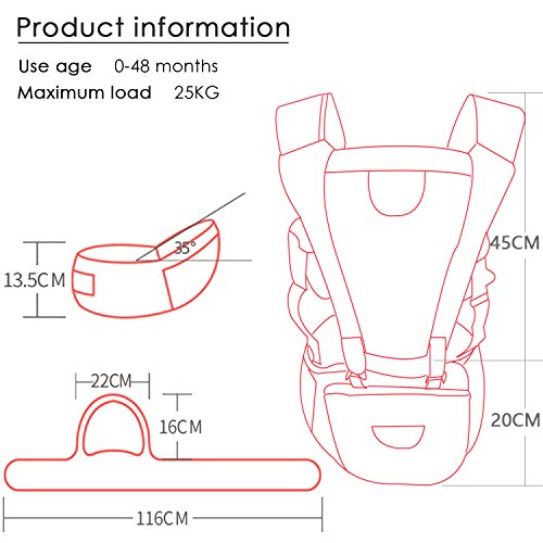 - 適用年齢と体重:赤ちゃんの0-48ヶ月、最大荷重:25KG、シングルシート:20KG、調節可能なウエストサイズは最大45.7インチ(約116cm)です。
