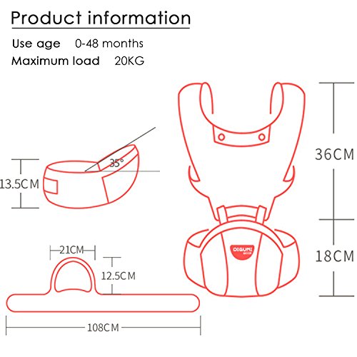 - 適用年齢と体重:赤ちゃんの0-48ヶ月、最大負荷:20KG、調節可能なウエストサイズは最大45.7インチ(約116cm)になります。