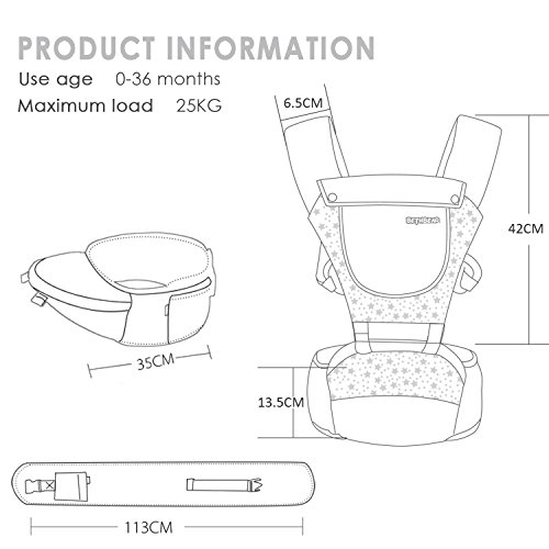 - 適用年齢と体重:赤ちゃんの0-36ヶ月、最大負荷:25KG、調節可能なウエストサイズは最大44.5インチ(約113cm)になります。