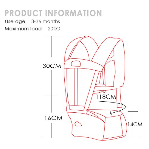 - 適用年齢と体重:赤ちゃんの0-36ヶ月、最大負荷:20KG、調節可能なウエストサイズは最大44.9インチ(約114cm)になります。