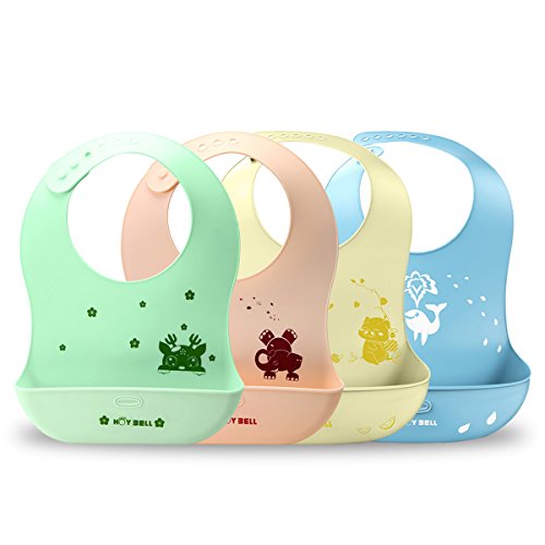 SONARIN防水シリコンビブス【日本正規品】100%食品グレード素材ベイビービブス快適なワイプクリーナー、ワイドポケット付きスーパー快適な調節可能乳幼児の授乳用ビブ、4枚組( ブルー / イエロー / グリーン / ベージュ)