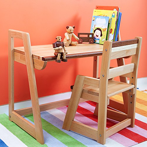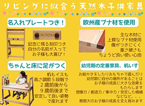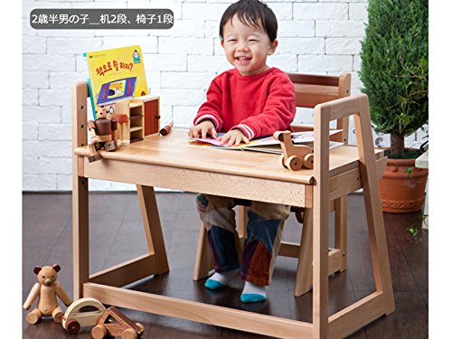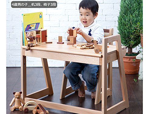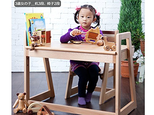5段階調節可能な机と椅子。 幼児期のお子様に、はじめての机と椅子のセットです。 絵を描いたり絵本をみたり、折り紙をしたり。人形や車を出して空想の世界へ飛んでみたり。 時にはおやつを食べるのにも。 自分の居場所があれば大喜びするだけでなく、遊びにじっくり取り組め集中力を養うのにも役立ちます。 2歳くらいから8、9歳まで、 幼稚園から小学校低学年くらいまでのお子様におすすめです。 天然木材の家具が、リビングにおいても、どんなインテリアにも馴染みます。 お子様が机に座る習慣作りには、絶対おすすめアイテムです。 幼児期に、食べるときや、絵を描いたり、勉強しているときなど、椅子に座る機会は多いと思いますが,足が床や足台にきちんと付いていることが、姿勢のためにも、集中力のためにも、大切だと言われています。 5段階調節可能なら、成長に応じて簡単に高さを変えられ、ぴったり合った状態でお使いいただけます。