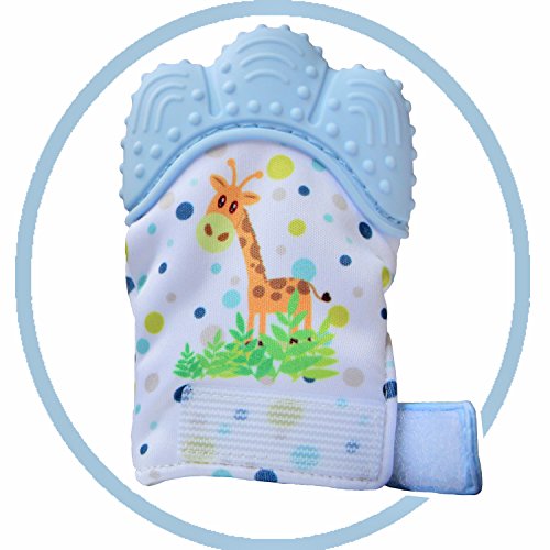 SOYARキリンベビー歯固めシリコン手袋、よだれ吸収し、手を噛んでいないように保護します、赤ちゃんの歯痛みを和らげます。3~12ヶ月対象(調節可能なベルクロストラップ付き)1個 (キリンブルー)