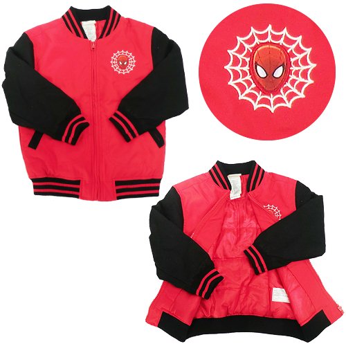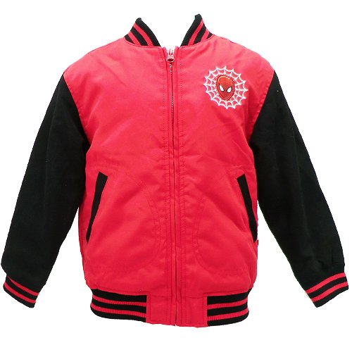 アメリカ直輸入、SPIDERMAN(スパイダーマン)スタジアムジャンパー(ブラック×レッド) 軽くって暖かい中綿入りジャケット☆ 両脇ポケット付き ポリエステル100% XS(3/4才)=身幅33cm、肩幅32cm、袖丈35cm、着丈40cm S(5/6才)=身幅36cm、肩幅33cm、袖丈41cm、着丈46cm M(7/8才)=身幅39cm、肩幅34cm、袖丈45cm、着丈48cm L(10才)=身幅40cm、肩幅35cm、袖丈49cm、着丈53cm 洗濯機可 仕入れ国:アメリカ・生産国:中国
