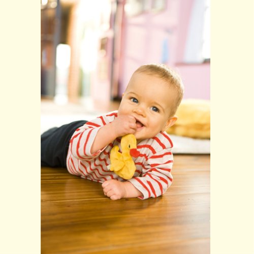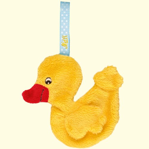 アヒルのネッリ(Nelli)のくしゅくしゅラトル。ぬいぐるみのようなソフトなタッチに、握るとくしゅくしゅカシャカシャと鳴る音で、赤ちゃんの聴覚を刺激します。ストラップつきなので、ベビーカーのバーに掛けてお出かけする事もできます。商品はドイツの知育玩具です。