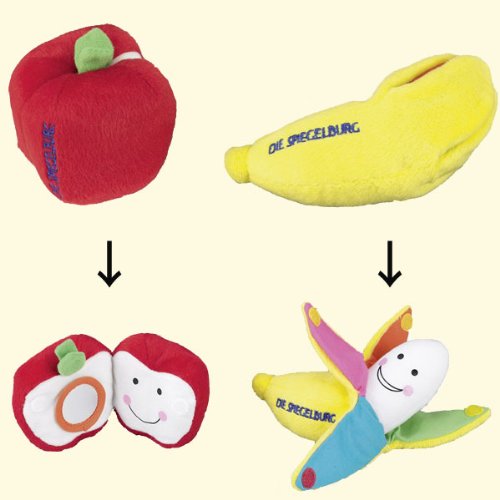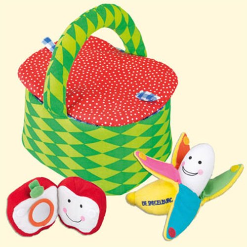 バスケットをあけると、可愛いリンゴとバナナのぬいぐるみが出てきます。リンゴもバナナも皮をむいてみると・・・なんとさらに可愛いリンゴちゃんとバナナちゃんがひょっこり顔を出し、赤ちゃんも大喜び!という、ぬいぐるみタイプの可愛いドイツの知育玩具です。目と手の感覚を養います。 リンゴには安全鏡がついてます。 ヨーロッパ安全基準CEマーク付