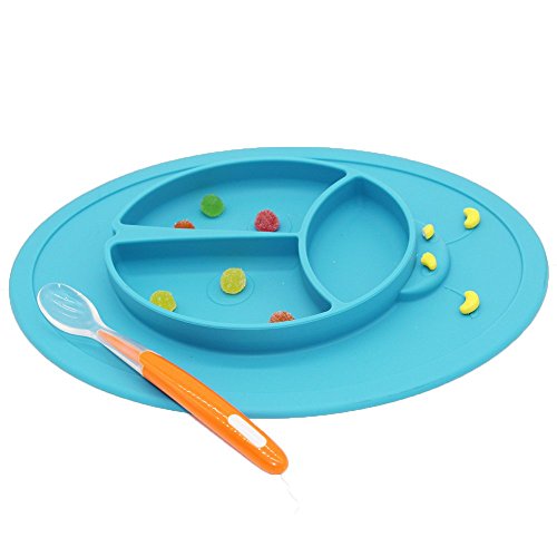 シリコンベビープレースマットボウル - ハイソットトレイ、幼児/子供用離散した吸引スリッププレート離乳食用プレースメート、ソフトスプーン付き (ブルー)