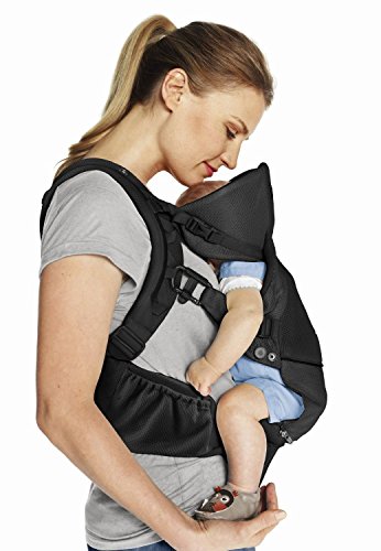 From birth and up to 3 years with 2-way front and back carrying., In parent facing position the child has the "Happy Hips" posture - a broad seating position with goo, Optional head support, when the child is sleeping, is available in a pocket on the back carrier., Textiles made from organic fibers., Ergonomically designed waist belt, back support and shoulder straps for parent.