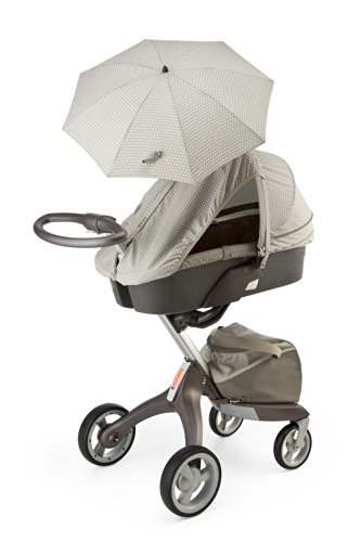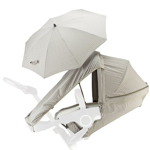 ストッケ エクスプローリー(別売)での夏の外出をより快適にするアクセサリー、サマーキット。夏の強い紫外線からお子さまを守るパラソルと日よけカバー、メッシュを採用して通気性がさらにアップしたフードとシートバックカバー、素肌をさらっと快適に保つタオル地のシートカバーがセットになっています、