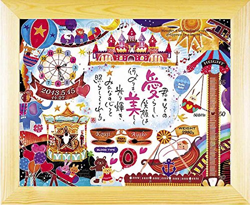 出産祝いの贈り物や、お子様の誕生日記念に。かわいいイラストの中に誕生の記録をお入れします。