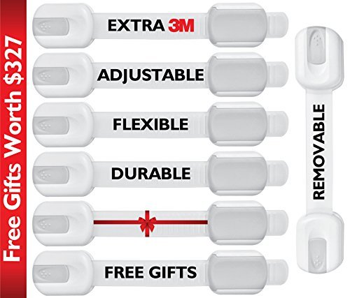 CHILD PROTECTION MADE EASY WITH PATENTED LATCH: Each flexible and adjustable child safety latch works as a refrigerators, microwave, oven, cabinet, freezer dishwasher, stove door latch, cupboards latch, appliance & furniture safety strap, toilet seat covers and more. Safety catches to secure your infant from getting something they're not supposed to.;REDUCES CLUTTER & TIME SPENT CLEANING: By childproofing cabinets and drawers in your kitchens and bathrooms, you'll be amazed at how much less you have to clean up each day. The buttons of our premium locks are designed to guard babies and toddlers and pets who could be mischievous and curious.;7 FREE GIFTS -INCLUDING REVOLUTIONARY NEW STRAP: For a limited time, each pack comes with a multi-action strap with a unique smart dual buttons, industrial universal grade 3M adhesives pad (tape), 17 parenting EBooks, discount vouchers, and more! This is a $327 value absolutely FREE.;USE THEM OVER AND OVER ALL OVER THE HOUSE & BATHROOM: Designed for electrical and kitchen safety, our top proofing products are not only reusable, they're strong and flexible enough to use as a light furniture anti-tip latch. Our accessories are screwless and require no power drill to install, so no damage to your home!;MONEY BACK GUARANTEE: If you aren't 100% satisfied with our multi-use strips, simply return everything to us within 30 days for a full, no questions asked refund or replacement. Buy Now- babyproofing & childproofing your home and nursery is 1st key priority! Plus it makes the best gift for newborn shower!