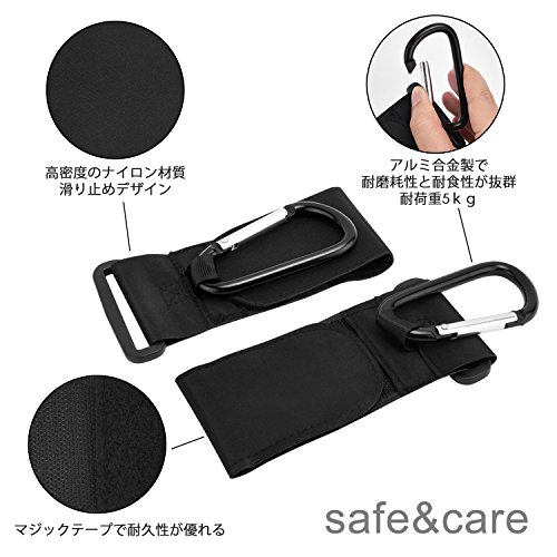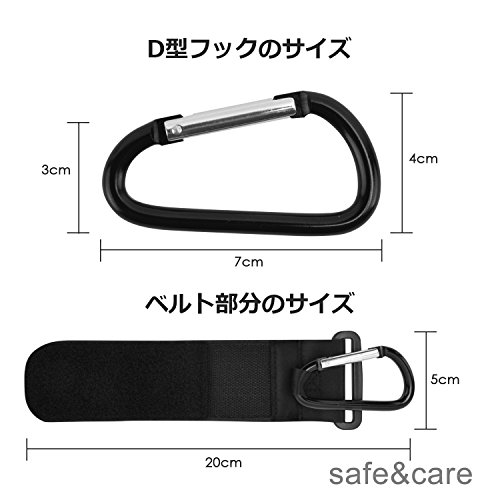 Safe&Care ベビーカーフック 荷物フック 荷物かけ フック アルミ 取付簡単 マジックテープ付き 2個セット【ブラック】