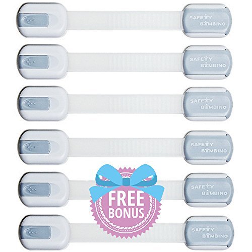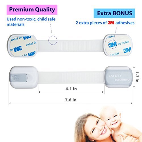 BABY PROOF YOUR HOME: Secure cabinets, drawers, refrigerators, ovens, toilet seats and other potentially dangerous spots and appliances. Safety Bambino child safety locks are adjustable, easy to install, non-toxic and come with a full money back guarantee.;NON-TOXIC: Safety Bambino safety locks are made from 100% non toxic, BPA free, lead free materials.;EASY TO INSTALL: Install in 1 minute, just peel back 3M adhesive and you're done, simple and fast baby proofing. No drilling, no screws, no tools needed. Easy for adults to handle, extremely difficult for child to unlock!;RE-USABLE & ADJUSTABLE: Flexible, adjustable-length strap works on most surfaces and around corners. 3M original adhesive stays secure until you're ready to take it off. As a gift we provide 2 extra pcs of 3M adhesive so you can move the child safety latches and re-use them as needed.;MONEY BACK GUARANTEE: Your child safety and your satisfaction are our main concern. Every child proofing product we sell is covered with our No Questions Asked 100% Money Back Guarantee!