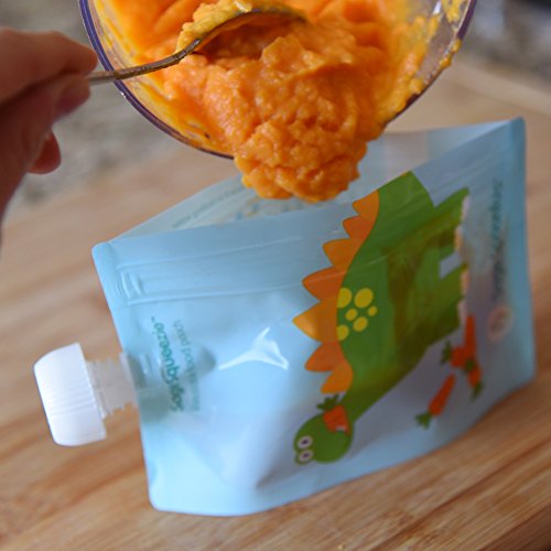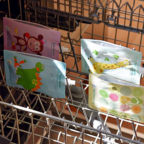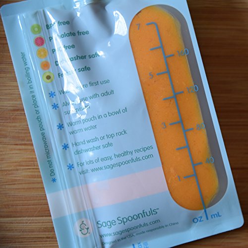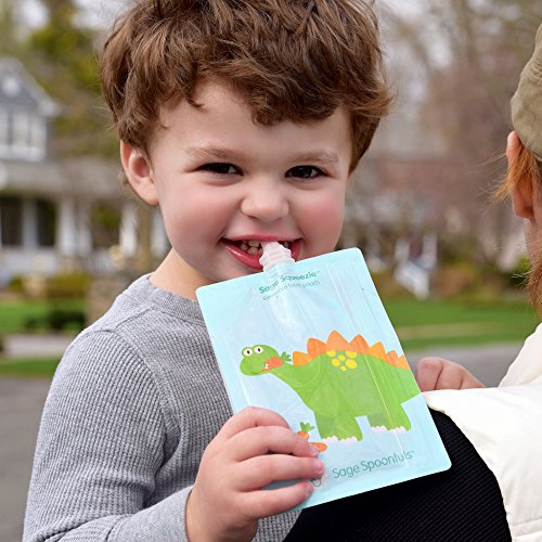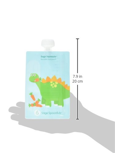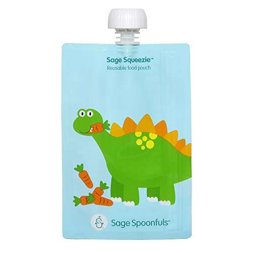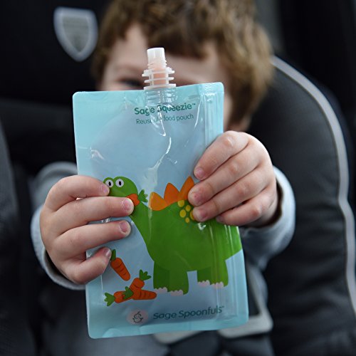 EASIEST NO MESS FILLING - Entire side opens up for easy, no mess filling - no need to buy a separate filling station!;FAST, SIMPLE CLEANING AND DISHWASHER SAFE --Simply rinse out excess food and place over the prongs on the top rack of your dishwasher. Features rounded interior corners to ensure thorough cleaning - food won't get stuck;FREEZER SAFE--save time and money making baby and toddler food in bulk.;CONVENIENT 7oz CAPACITY , FOR BABY TO BIG KID --perfect for baby food, toddler snacks or big kids lunch. Handy measurement marks with max fill line.;HIGH QUALITY, DURABLE, LESS PLASTIC AND WASTE--Very strong double zip closure that little hands can't squeeze open and make a mess. Help keep wasteful single use pouches out of landfills by with reusable Sage Squeezies. BPA, Phthalate, Lead and PVC free;? EASIEST NO MESS FILLING - Entire side opens up for easy, no mess filling - no need to buy a separate filling station!;FREEZER SAFE--save time and money making baby and toddler food in bulk. Store in freezer; stays fresh for up to 3 months. Easily defrost in the fridge or bowl of warm water. Works as freezer pack for big kid school lunches; defrosting just in time to eat.;CONVENIENT 7oz CAPACITY, FOR BABY TO BIG KID --perfect for baby food, toddler snacks or big kids lunch. Handy measurement marks with max fill line. Great for little hands with a leak proof and safe, no choke cap.