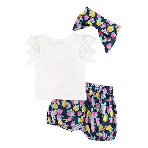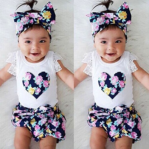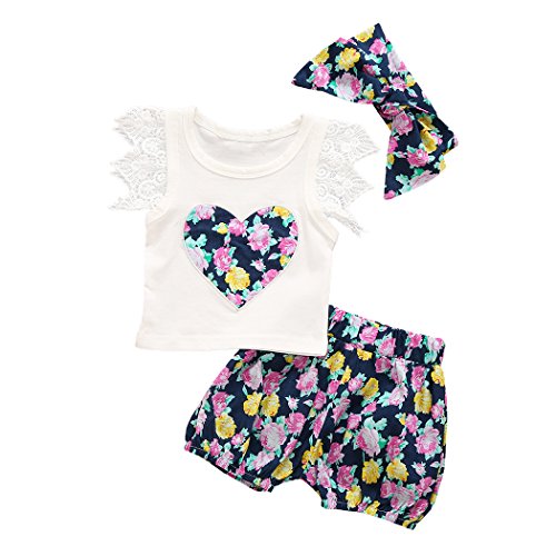 sakulala 子供服 Tシャツ パンツ 3点セット 心型 花柄 ヘアバンド付き レース ノースリーブ ベビー服 女の子