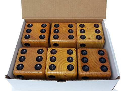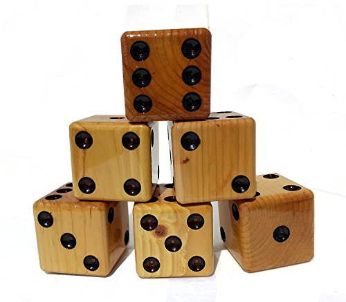 Yard dice set. Contains six dice made from hemlock fir. Dice are approximately 3 3/8' x 3 3/8' x 3 3/8' in size. Edges are rounded and entire dice is sanded smooth to 220 grit to prevent splinters. Black dots or “pips' are recessed just like game dice, th