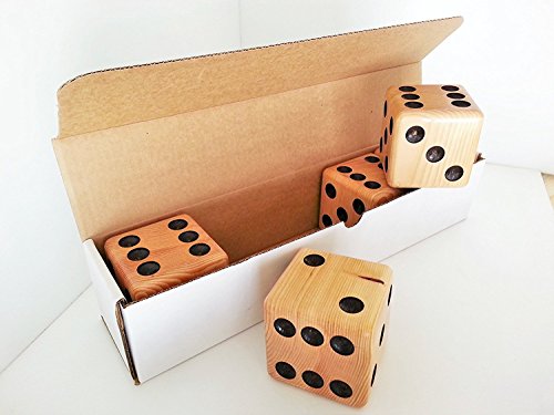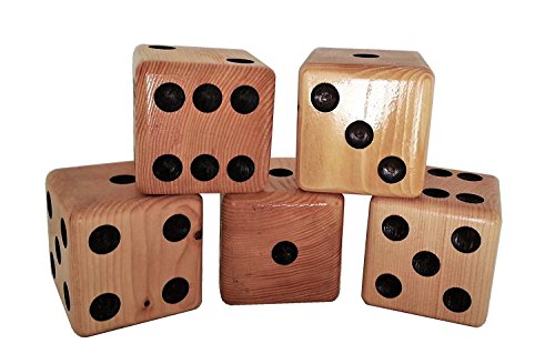 Yard dice set. Contains five dice made from Hemlock fir (whitewood). Dice are approximately 3 3/8' x 3 3/8' x 3 3/8' in size. Edges are rounded and entire dice is sanded smooth to prevent splinters. Black dots or 'pips' are recessed just like game dice, t