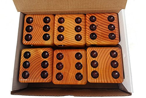 Yard dice set. Contains six dice made from Douglas fir. Dice are approximately 3 3/8' x 3 3/8' x 3 3/8' in size. Edges are rounded and entire dice is sanded smooth to 220 grit to prevent splinters. Black dots or “pips' are recessed just like game dice, th