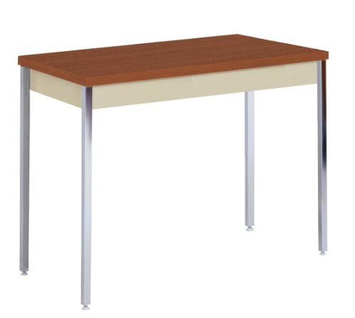 Rounded corner laminate tops 1-1/4" thick. 3", 18-gauge steel aprons. Powder coat finish. 1-1/4" chrome plated tubular square legs adjust at 1" increments from 24" - 36" height. Adjustable floor glides. Mobile: 2, minor assembly type. Putty color. Measures 29" height by 40" width by 20" depth.
