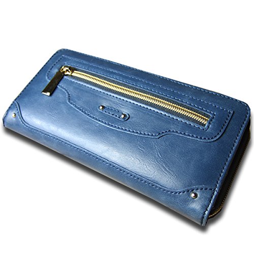 スタッズ使い微光沢フェイクレザーのファスナー長財布NV