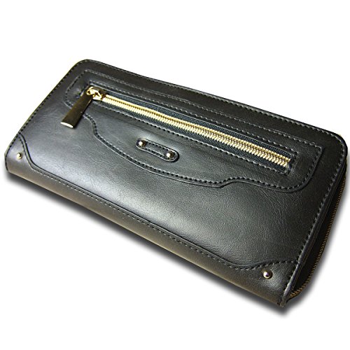 スタッズ使い微光沢フェイクレザーのファスナー長財布BK