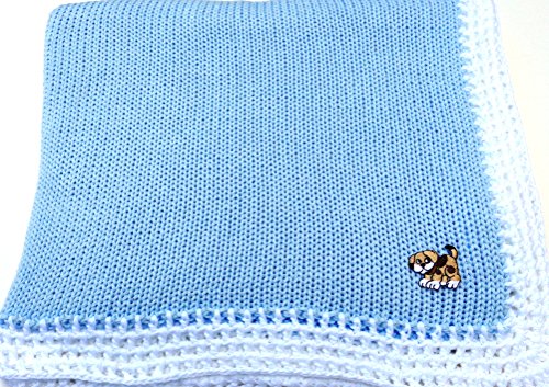 ニットかぎ針編み仕上がりブルーコットンホワイトトリムこの最高品質コットンで作られ赤ちゃんの毛布とブラウン犬では、1米国と認定し、CPSIAにフタル酸鉛フリー。