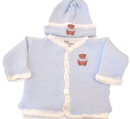 ニットかぎ針編み仕上げでブルーのコットンホワイトシェニールトリムカーディガン帽子セットテディベアのアップリケ