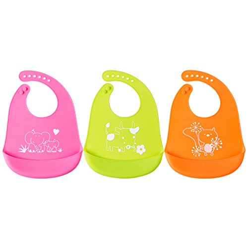 Sasairy 3色セット 防水スタイ シリコン ベビービフ 大きいポケット付き お食事用 ソフトスタイ 赤ちゃんエプロン 5段階 サイズ調整可能 キッズよだれかけ 動物柄 清潔易い 持ち運び 食事用グッズ 男の子・女の子兼用