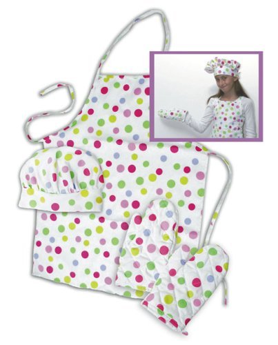 22101 Features: -Sized just for kids, this sweet polka dot pattern will keep your little cook in style in the kitchen. -Apron made of 80% polyester/20% cotton. -Hat made of 80% polyester/20% cotton. -Mitts made of 80% polyester/20% cotton; filler made of 100% cotton. -Machine washable and fits sizes 4-8. Product Type: -Housekeeping. Color: -White. Number of Items Included: -4. Kitchen Accessories Included: -Yes. Age Group: -5 to 6 Years/7 to 8 Years/9 to 10 Years/11 to 12 Years/13+ Years. Dimensions: Overall Height - Top to Bottom: -17.75". Overall Width - Side to Side: -11.25". Overall Depth - Front to Back: -1".