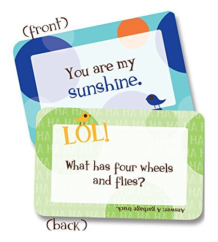 Lunchbox Love? - positive notes and silly jokes for your child's lunchbox, backpack, binder, or pillow. We all want to stay connected with our kids even when we can't be with them. Lunchbox Love? is an easy yet meaningful way to share love and happiness throughout the school day. Positive words on the front (e.g Believe in yourself!) inspire while fun jokes (e.g., Why do hummingbirds hum? They forgot the words) and facts on the back entertain.