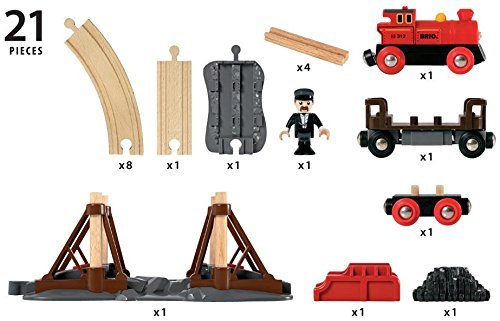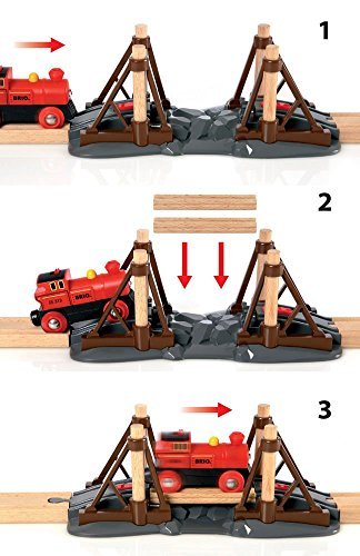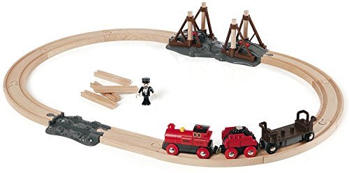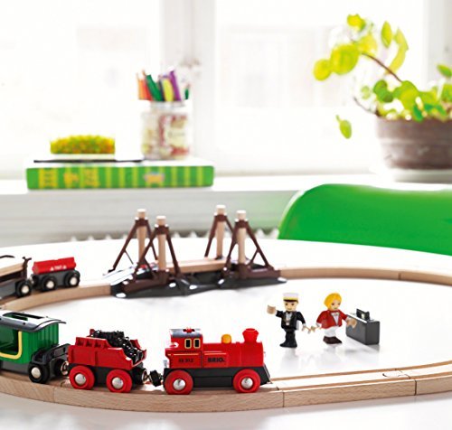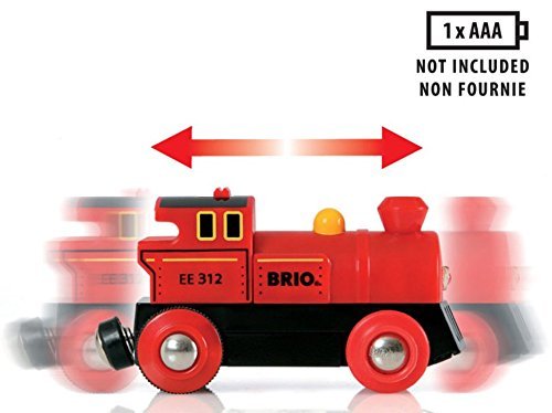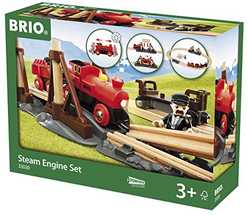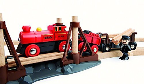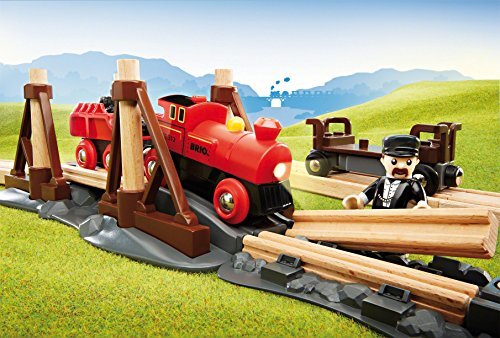 Founded in Sweden in 1884, BRIO makes the highest quality wooden toys that have delighted children and created happy memories for generations. Both educational and fun, BRIO's uncompromising focus on design, quality and craftsmanship create toys of lasting value that stimulate creativity and imagination. Engaging play and learning are integral themes in all Brio toys, satisfying a child's educational needs and growing with them through their various phases of development. Travel back in time with the battery operated Steam Engine Train Set and lay down the first railway tracks on your new adventure! Load the special track sections onto the rail car and travel to the crossing. The train waits at the bridge while you add the rails to complete the railway over the chasm. Power forward with the push of a button, the headlight will light the way. 1 AAA battery required, not included.
