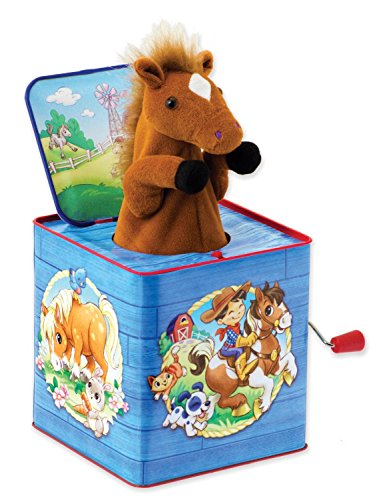 The Poppin' Pony Jack in the Box, a Schylling Original, from Schylling Toys the world leader in traditional toys and classic fun, will be sure to bring a smile to cowboys and cowgirls everywhere. The Jack in the Box has been bringing joy to children for generations. A simple turn of the handle plays a classic tune until the plush pony pops up, delighting a child. The tin box is decorated with embossed pony scenes that will entertain and engage. It's the perfect addition to every child's toy chest. For ages 18 months+.