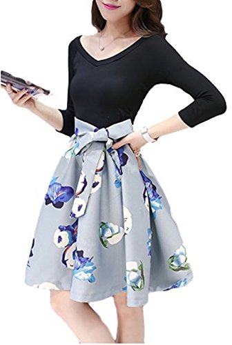 - 上半身が伸縮性のある黒無地タイトトップスで、Aラインの綺麗な花柄フレアスカートの下半身と、ドッキングがお洒落なバランスの良いシルエットが魅力的。大きめに空いた襟ぐりvネックで、デコルテを美しく華奢に見せヌケ感をプラスします。手首が華奢に見える袖丈もポイント!