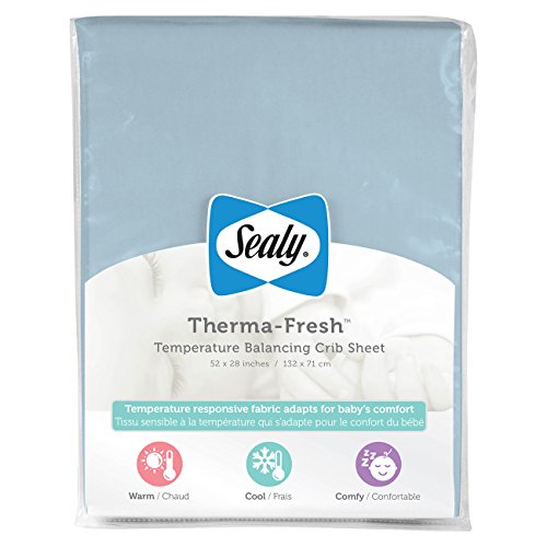 Revolutionary temperature regulating fabric adapts for baby's comfort - infused fibers never wash out;Moisture wicking fibers respond to baby's body temperature by absorbing heat for warmth and releasing excess heat and moisture to keep baby cool, comfortable and dry;Soft, hypoallergenic materials for baby's comfort and machine washable for easy cleaning;Sheet is 52 L x 28 W with SecureStay fitted stretch skirt and elasticized edge for a snug, secure fit on USA standard size crib and toddler bed mattresses;Sealy baby bedding is America's most recommended brand, winning the Women's Choice Award in 2013, 2014 and 2015