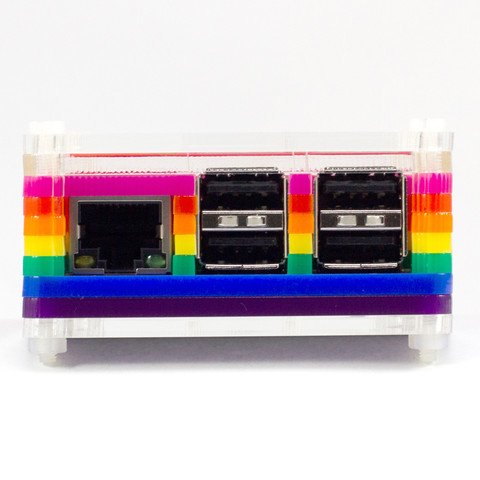 The all-new Pibow for the Raspberry Pi Model B+ redesigned with add-on boards in mind. The Model B+ Rainbow is a sleek, durable and attractive case crafted out of eight unique layers with a transparent top and base that leave your beautiful Pi visible inside. Each layer is laser-cut from colorful high-quality cast acrylic (or spruce in the case of the Timber) and once stacked they securely contain a Raspberry Pi Model B+ while leaving the primary ports, including the camera port, accessible.