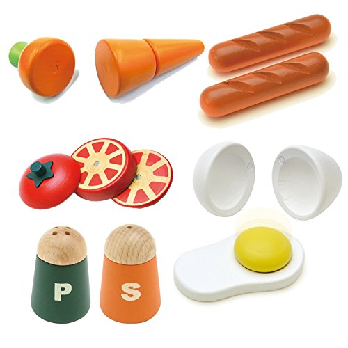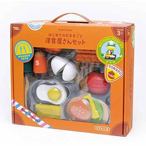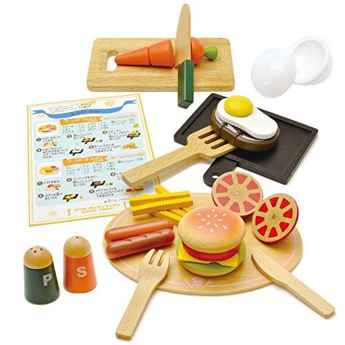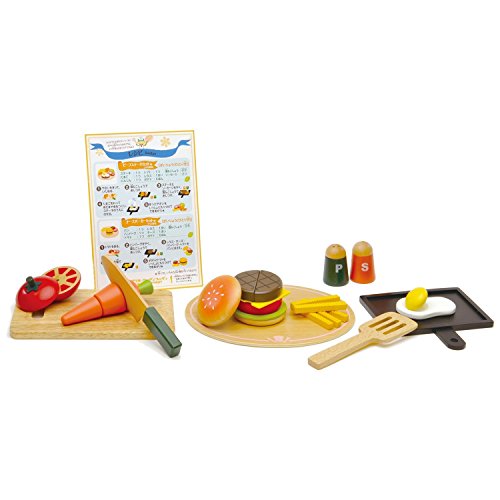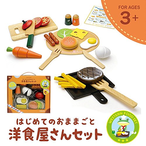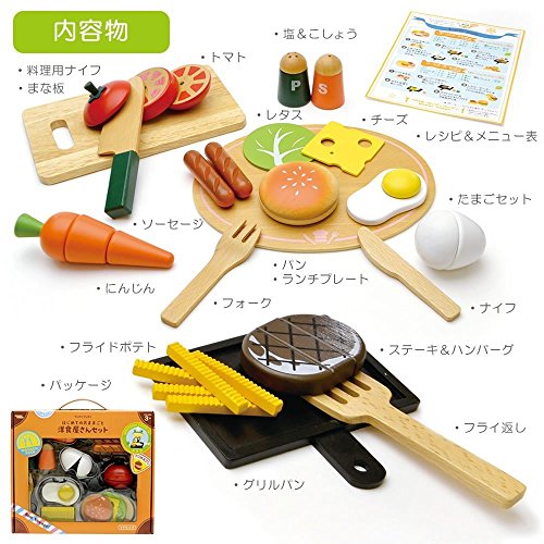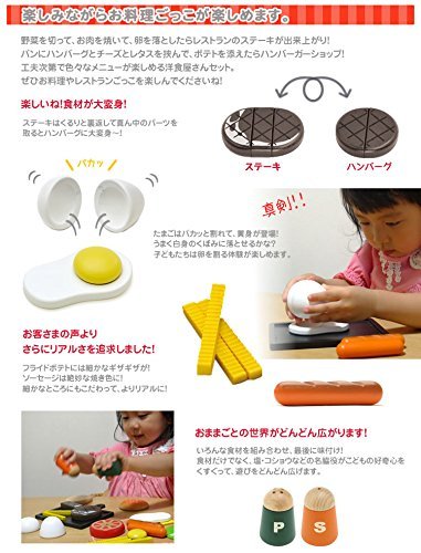 切って焼いて盛り付けて洋食屋さんごっこができます。パカッと割れて目玉焼きのできるたまごが特典でついた洋食屋さんセットはメニューで注文、レシピが付いてきます。ごっこ遊びまで展開できるので、おままごとの世界が一層広がります。ステーキは真ん中を外すとハンバーグになります。塩コショウは振ると音がなります。