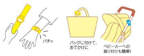 - くるっと装着ができるため、お子さまの細い手首はもちろん、カバンや抱っこひも、ベビーカーにも付けられます。
