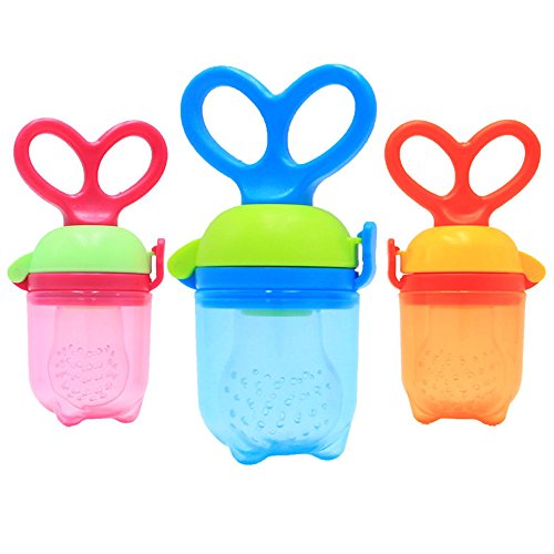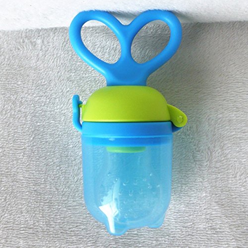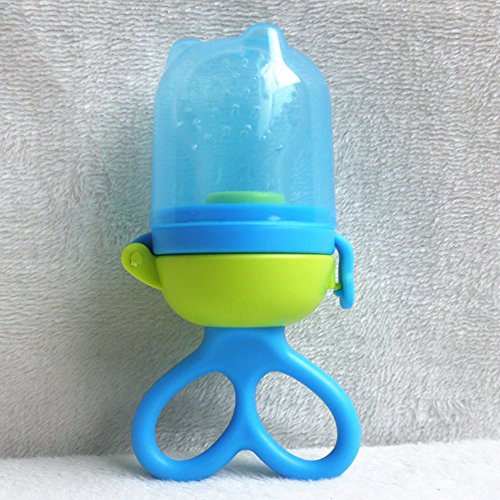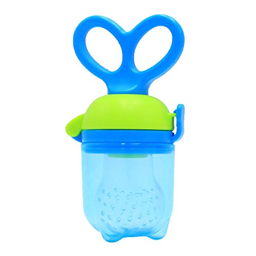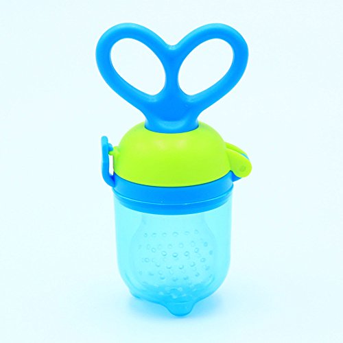 赤ちゃんが食べ物を楽しむためにシリコーンストレーナネットを吸うためにハンドルを保持します。