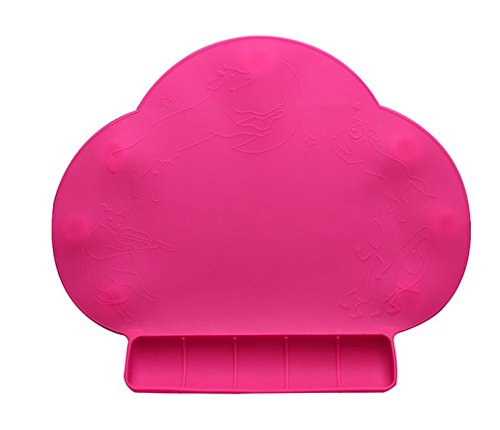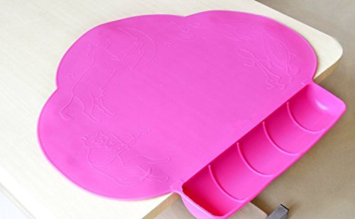 テーブル面に広げれば、ワイドな受け皿として、食べこぼしをキャッチする。サッと拭けばきれいになるから、"手づかみ"の頃には直接食べ物をのせてお皿のように使って。裏面には吸盤がついているので、滑りにくい構造。くるくる丸めて受け皿部にすっぽり収納できるので、おでかけ時携帯できて大活躍。