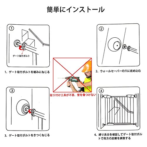 - 取付簡単:取り付け工具が必要なく、壁を傷つけないままにゲイトの取付ボルトをウォールセーバーの穴にはめ込むだけで完成します。