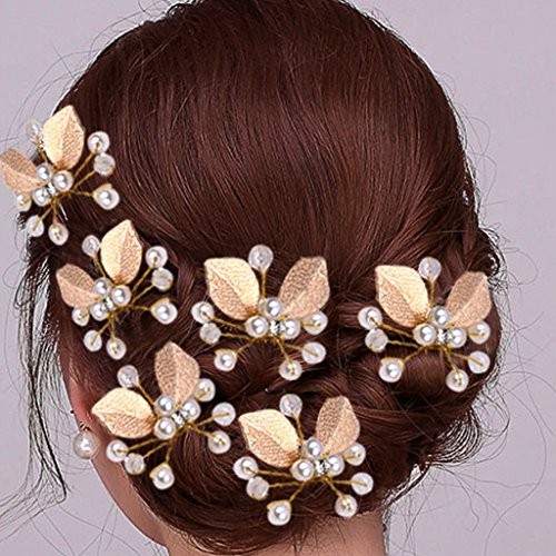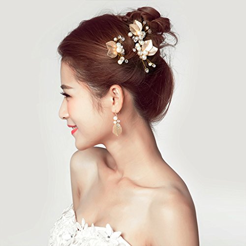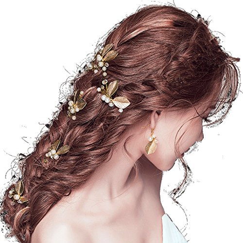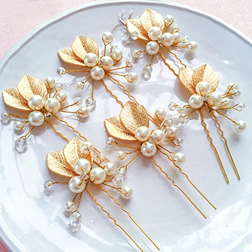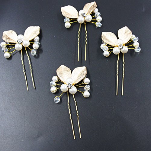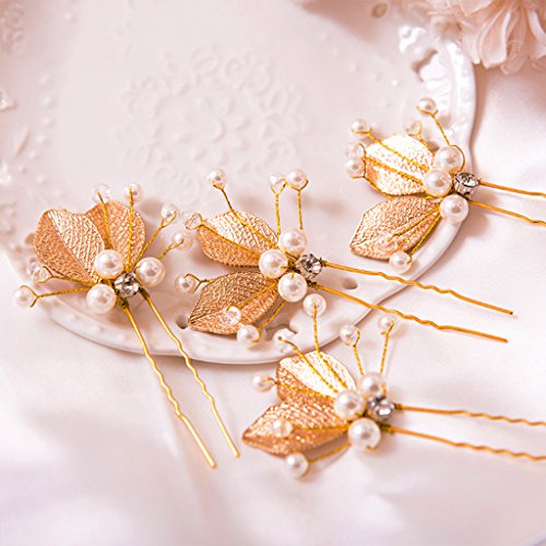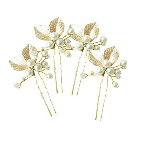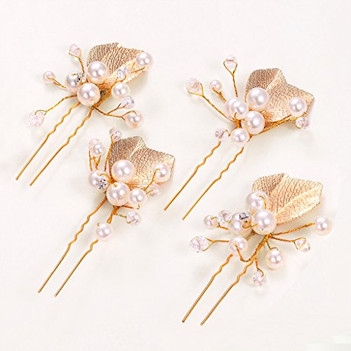 Seliyi ゴールド 葉っぱ モチーフ 髪飾り 華奢 パール Uピン セット 結婚 パーティ ヘア アクセ ドレス 着物 (ゴールド 4個)