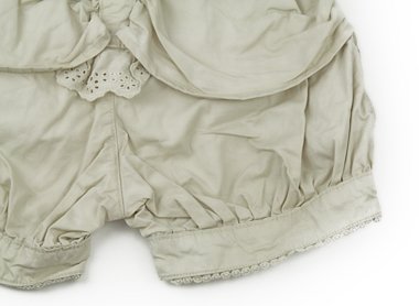 シャカシャカとハリ感あるカジュアルな綿100%。後ろ裾付近にペンのような小さなシミがあります。レースやフリルがとってもラブリーなお品。まだまだ活躍してくれそうです。