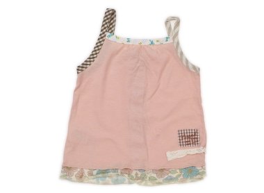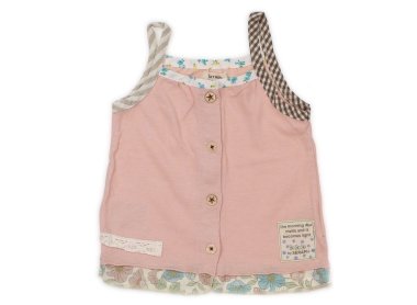 淡いピンクのスカートに、裾や肩紐などのデザインがとてもかわいいジャンパースカートです。目立った汚れのない良品です。