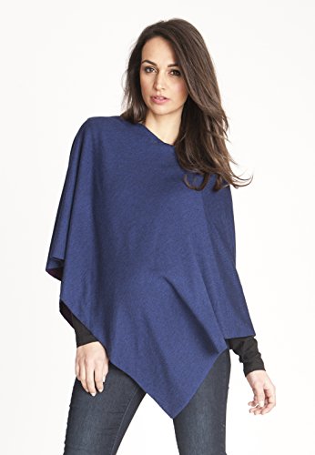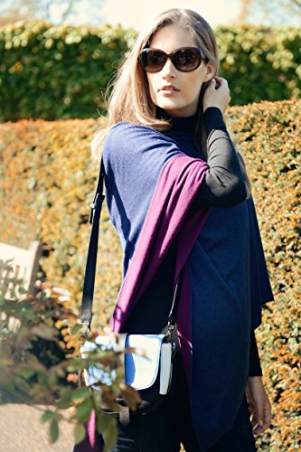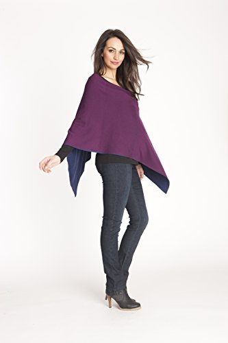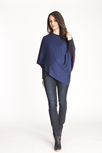 コートでは重い時期にポンチョタイプで羽織ることができるウールとコットン、肌触りと吸湿性の良いバンブーレーヨン素材のニットケープです。インディゴブルーとパープルカラーの両面をリバーシブルで使えるタイプで、モデルの写真のように2つのカラーが出るようにかけても素敵。産後の授乳ケープとしてもお使いいただけます。軽いので折りたたんで持ち歩き、温度調節ができる羽織ものとしても便利です。