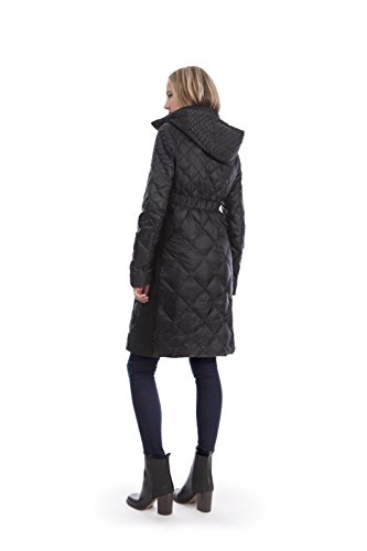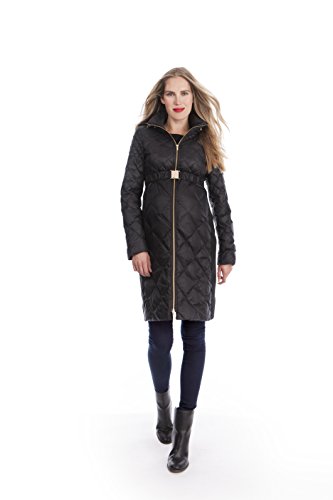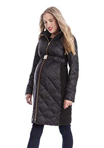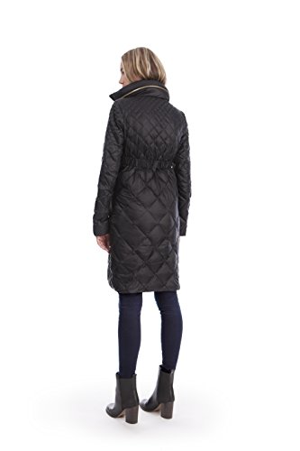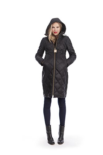 オールマイティーなブラックカラーにダイヤモンド型のステッチが入ったエレガントなダウンコート。シティスタイルにも合うのがうれしいデザイン。マタニティ期間は通常のコートですと前が閉められず、とても寒いのですが、こちらはマタニティ用として作られているので、しっかり前を閉めることができ、かつ、産後も変わらず着用いただけます。 フィリングも90%ダウン使用で温かく、着丈も長いので、防寒ができます。
