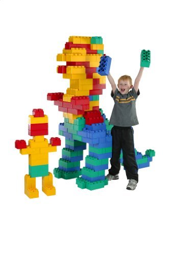 Jumbo sized colourful interlocking blocks made in the USA out of durable poly-propylene. Jumbo set makes tons of shapes like huge life-size vehicles, buildings, robots, animals, air planes, forts, walls, lemonade stands and more. The options are endless. Large 8 x 4 inch blocks are great for little hands to hold and feature soft rounded edges for safe play. Helps children to develop eye to hand coordination and enhance motor skills while having tons of fun creating.